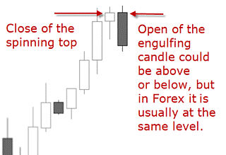 In Forex, you can consider the doji and a spinning top to have the same potential for reversal. For example, if a market reaches a new top as shown in the image below, and does so with a doji or a spinning top – that is a small real body with a long upper and lower shadow – the signal is the same: the market rejected the higher levels and shows determination on where to go next.