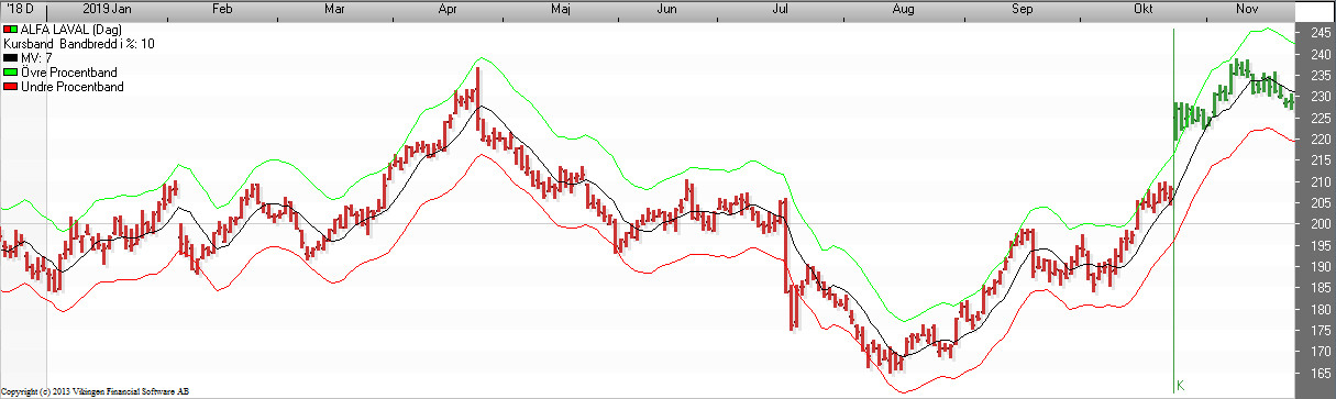 Trading band är linjer dragna på ett fast avstånd (i %) från ett glidande medelvärde. Principen är att en aktie brukar röra sig inom ett förutsägbart område på båda sidor om ett glidande medelvärde.